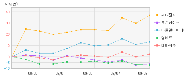 | 일자 | 써니전자 | 링네트 | 오픈베이스 | 다믈멀티미디어 | 테마지수 |