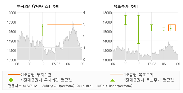 | 의견제시일자 | 증권사 | 투자의견 | 목표가 | | 20170929 | KB증권 | 매수(유지) | 15,000 | | 20170731 | 키움증권 | 매수(유지) | 15,500 |