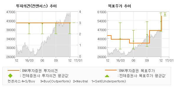 | 의견제시일자 | 증권사 | 투자의견 | 목표가 | | 20170103 | BNK투자증권 | 매수(신규) | 57,300 | | 20170102 | 미래에셋대우 | 매수(신규) | 60,000 | | 20161226 | 유진투자증권 | 매수(유지) | 60,000 | | 20161223 | 미래에셋증권 | 매수 | 60,000 |