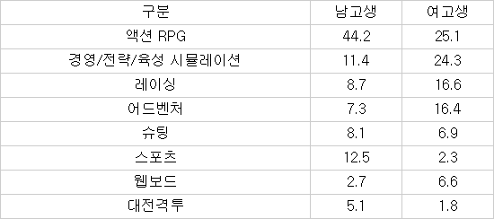 전자신문 미래기술연구센터(ETRC)와 서울마케팅리서치(SMR)가 모바일 게임을 이용한 경험이 있는 전국 고등학생 1000명을 대상으로 이용 실태와 인식을 조사한 결과, 여고생이 선호하는 게임 이용 장르는 액션 롤플레잉게임(RPG)이 25.1%, 시뮬레이션이 24.3%로 가장 많았다. 레이싱 게임, 어드벤처 게임도 각각 16.6%, 16.4%여서 여고생의 모바일 게임 이용이 다양한 것으로 나타났다. 반면에 남고생은 액션 RPG를 이용한다는 응답이 44.2%로 가장 높았으며 그 다음으로 스포츠 게임, 시뮬레이션이 각각 12.5%, 11.4%여서 가장 많이 이용하는 액션 RPG와 큰 차이를 보였다. 여고생은 자신이 좋아하는 장르가 다양하고 각자의 취향이 모바일 게임을 선택하는 데 중요한 기준으로 작용한 것으로 풀이된다. 여고생의 다양한 기호가 향후 모바일 게임 콘텐츠의 다양성을 이끌 것으로 예상된다.