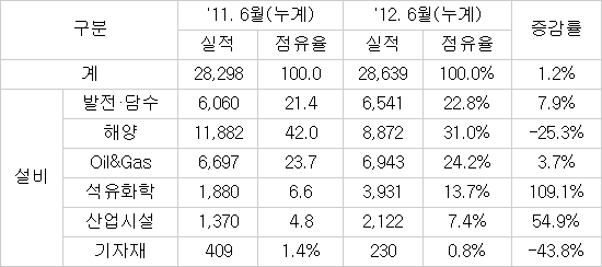 지식경제부와 한국플랜트산업협회는 상반기 해외 플랜트 수주실적이 전년 동기 대비 1.2% 증가한 286억달러를 기록했다고 3일 밝혔다.