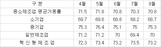 평균가동률 80% 이상인 정상가동업체 비율은 40.5%로 7월 38.8% 대비 1.7%포인트 증가했다.
