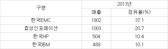한국EMC가 1802억원의 매출로 전체 시장에서 37.1%를 점유, 1위를 차지한 것으로 나타났다. 이어 효성인포메이션이 매출 1003억원, 점유율 20.7%로 2위를 차지했다.