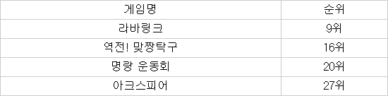 매출과 달리 다운로드 수와 평점으로 평가하는 인기 무료 카테고리에서는 다수 게임이 상위권에 올랐다. 밴드 게임의 대중 관심을 반영한 것으로 보인다. 인기무료에는 ‘라바링크’(9위) ‘역전! 맞짱탁구’(16위) ‘명랑 운동회’(20위) ‘아크스피어’(27위) ‘벽돌팡’(47위) ‘박자왕’(50위) 순으로 10개 중 6개 게임이 50위 안에 들었다.