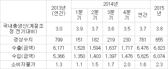 <KDI 2014∼2015년 경제전망 (전년동기대비, %, 억달러)>