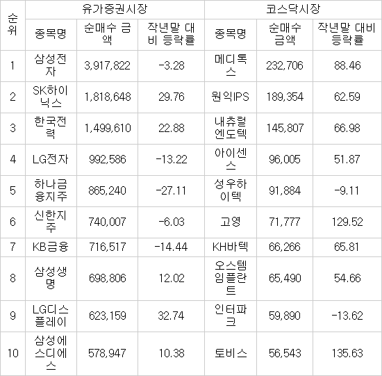 유가증권시장에서 외국인은 삼성전자(3조9178억원), SK하이닉스(1조8186억원), 한국전력(1조4996억원) 순으로 순매수했다. 코스닥 시장에서는 메디톡스(2327억원), 원익IPS(1893억원), 내츄럴엔도텍(1458억원) 순이었다.