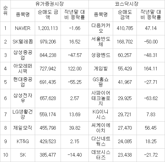 반면 유가증권 시장의 외국인 순매도 1위는 네이버(1조2031억원), 코스닥 시장의 순매도 선두는 다음카카오(4107억원)가 차지했다.