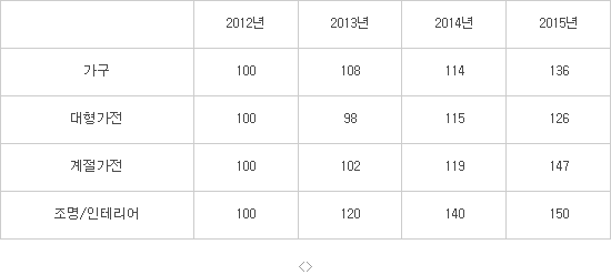 <이사 관련 주요 품목 최근 4년간 1분기 판매량 추이(2012년도 판매량 100 기준)>