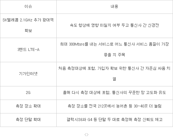 통신사업자 망 고도화 사업 성적표인 ‘2015년 통신품질측정’ 결과 발표가 한 달 앞으로 다가왔다. 올해 통신품질측정은 SK텔레콤 2.1㎓ 추가 광대역 확보로 어느 해보다 신경전이 치열했다. 3밴드 LTE-A와 기가인터넷이 처음 측정 대상에 포함되면서 통신사 긴장감이 고조되고 있다.