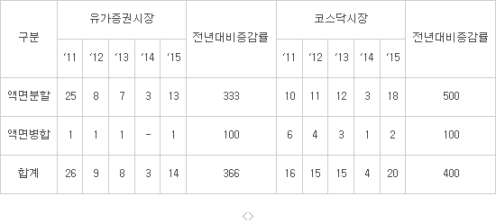 2015년 증권시장별 액면변경 현황 (단위 : 사, %)