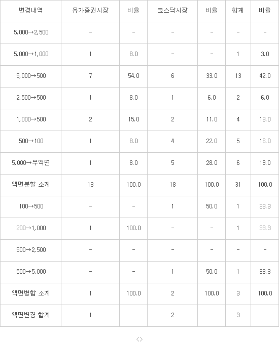 액면변경 유형은 1주당 액면금액을 5000원에서 500원으로 분할한 회사가 42%인 13곳으로 가장 많았다. 무액면 주식으로 변경한 곳은 중국원양자원유한공사 등 외국계 6곳이었다. 이밖에 500원에서 100원이 5곳, 1000원에서 500원 4곳, 2500원에서 500원 2곳 순이었다.