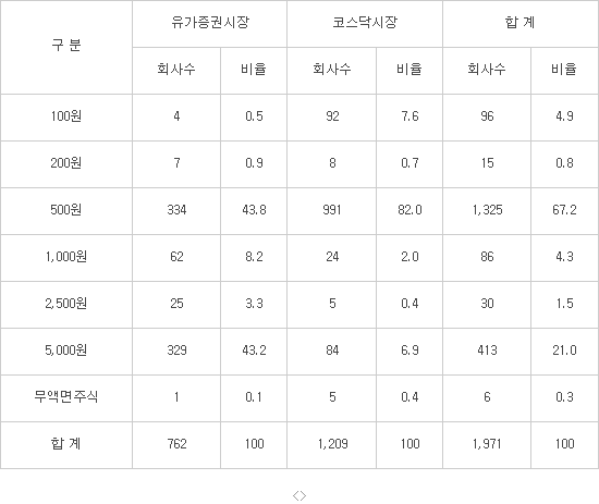 시장별 액면금액 분포 현황을 보면 유가증권시장은 500원과 5000원 기업이 각각 334곳과 329곳으로 비슷하게 분포된 반면에 코스닥시장은 500원 채택 기업이 991곳으로 82%를 차지했다.