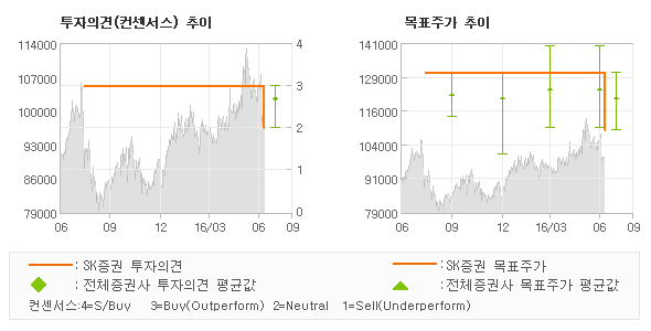 | 의견제시일자 | 증권사 | 투자의견 | 목표가 | | 20160707 | SK증권 | 중립 | 109,000 | | 20160707 | 미래에셋대우 | 매수(유지) | 122,000 | | 20160704 | 신한금융투자 | 매수(유지) | 130,000 | | 20160628 | 삼성증권 | 매수 | 135,000 |