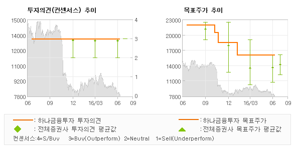 하나금융투자의 동종목에 대한 최근 1년동안의 투자의견은 전체적으로 큰 변화없이 유지되고 있다. 목표주가는 2015년7월 22,000원까지 높아졌다가 2016년2월 16,000원을 최저점으로 목표가가 제시된 이후 최근에도 16,000원으로 제시되고 있다. |