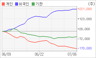 | 기관과 개인은 순매도, 외국인은 순매수(한달누적) 전일 기관이 6,901주를 순매수했고, 외국인은 265주를 순매도했다. 4주간을 기준으로 보면 외국인이 초반에 동종목을 순매수한 이후에 기세를 이어가며 220,634주를 순매수한 반면, 기관은 매도 관점으로 접근하면서 51,353주를 순매도했고, 개인들도 매도쪽으로 방향을 잡으면서 169,281주를 순매도한 것으로 집계됐다. |