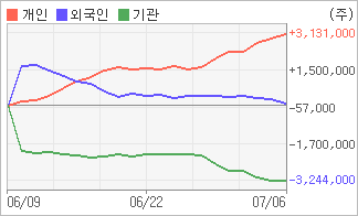 | 외국인/개인 순매수, 기관은 순매도(한달누적) 전일까지 외국인이 3일 연속, 기관이 7일 연속 각각 동종목을 순매도 했다. 4주간을 기준으로 보면 외국인이 매수 우위를 유지하면서 112,697주를 순매수했고, 개인들도 순매수량을 늘리며 3,130,726주를 순매수했다. 하지만 기관은 매도 관점으로 접근하면서 3,243,423주를 순매도했다. |