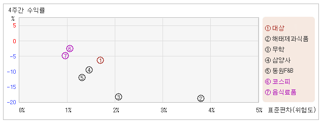 | 관련종목들 사이에서 변동성 낮아도 수익률은 높아 7일 오전 10시25분 현재 전일대비 1.45% 오른 27,950원을 기록하고 있는 대상은 지난 1개월간 6.37% 하락했다. 동기간 동안에 변동성을 나타내는 지표인 표준편차는 1.7%를 기록했다. 이는 음식료품 업종내에서 주요종목들과 비교해볼 때 대상의 주가가 월간기준으로 가장 선방했던 모습이며, 변동성도 적정한 수준을 유지했다는 뜻이다. 최근 1개월을 기준으로 대상의 위험을 고려한 수익률은 -3.7을 기록했는데, 주가는 약세를 보였지만 위험대비 수익률은 가장 높은 수준에 머물러 있다. 뿐만아니라 음식료품업종의 위험대비수익률인 -5.4보다도 높기 때문에 업종대비 성과도 좋았다고 할 수 있다. 다음으로 업종과 시장을 비교해보면 대상이 속해 있는 음식료품업종은 코스피지수보다 변동성과 수익률이 모두 낮은 모습을 보여주고 있다. 다시 말해서 동업종의 탄력은 약한 반면 하락시에도 지수보다 낙폭이 작다는 의미이다. |
