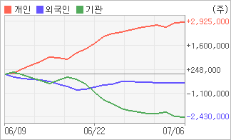 | 외국인과 기관은 순매도, 개인은 순매수(한달누적) 7월5일부터 전일까지 기관이 2거래일 연속 순매도를 보였다. 4주간을 기준으로 보면 외국인이 매도 후 매수의 관점을 보이고 있음에도 불구하고 495,576주를 순매도했고, 기관도 매도 관점으로 접근하면서 2,429,328주를 순매도했지만, 개인은 오히려 순매수량을 늘리며 2,924,904주를 순매수했다. |