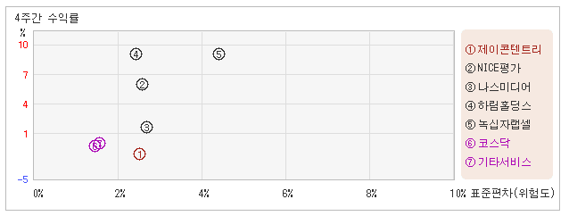 | 관련종목들 가운데 변동폭 커도 수익율은 낮아 7일 오전 11시10분 현재 전일대비 4.1% 오른 4,315원을 기록하고 있는 제이콘텐트리는 지난 1개월간 2.38% 하락했다. 같은 기간동안 변동성의 크기를 말해주는 표준편차는 2.5%를 기록했다. 이는 기타서비스 업종내에서 주요종목들과 비교해볼 때 제이콘텐트리의 월간 변동성이 큰 편은 아니었으나 주가등락률은 마이너스를 기록하면서 주요종목군 내에서 가장 낮은 수준을 유지했다. 최근 1개월을 기준으로 제이콘텐트리의 위험을 고려한 수익률은 -0.9를 기록했는데, 주가 약세와 더불어 위험대비 수익률도 부진을 면치 못했다. 게다가 기타서비스업종의 위험대비수익률 -0.7보다도 낮기 때문에 업종대비 성과도 좋지 않았다고 할 수 있다. 다음으로 업종과 시장을 비교해보면 제이콘텐트리가 속해 있는 기타서비스업종은 코스닥지수보다 변동성과 등락률이 모두 높은 모습이다. 업종등락률이 마이너스지만 시장보다는 탄력이 있고, 흐름도 좋다. |