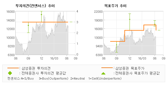 삼성증권의 동종목에 대한 최근 1년동안의 투자의견은 전체적으로 큰 변화없이 유지되고 있다. 목표주가는 2015년8월 11,000원이 저점으로 제시된 이후 2016년4월 17,000원을 최고점으로 목표가가 제시되었고 최근에는 15,000원으로 다소 하향조정되고 있다. |