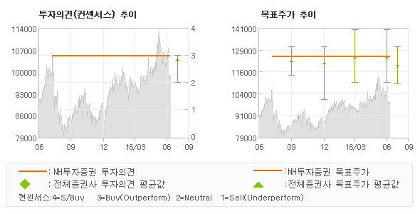 NH투자증권의 동종목에 대한 최근 1년동안의 투자의견은 전체적으로 큰 변화없이 유지되고 있다. 목표주가는 2015년6월 110,000원이 저점으로 제시된 이후 이번에 발표된 125,000원까지 꾸준하게 상향조정되어 왔다.