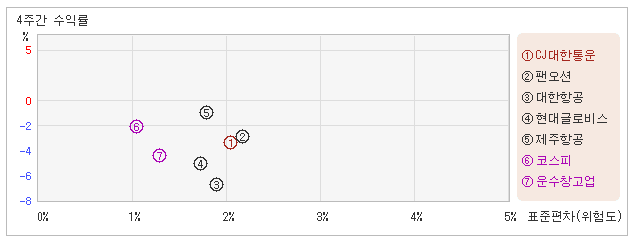 다음으로 업종과 시장을 비교해보면 CJ대한통운이 속해 있는 운수창고업업종은 코스피지수보다 변동성은 높고, 등락률은 낮은 모습이다. 하락할 때 지수보다 탄력을 받고 있다는 의미이다.