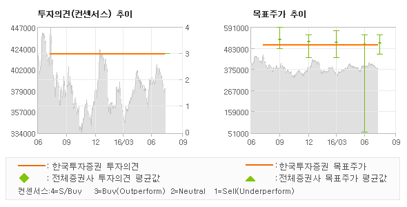 | 오늘 한국투자증권에서 발표된 '매수(유지)'의견 및 목표주가 500,000원은 전체 컨센서스 대비해서 대체적으로 평균치에 해당하는 수준으로, 이번 의견은 동종목에 대한 전체적인 흐름에서 크게 벗어나지 않은 것으로 파악되며 목표가평균과 대비해서 미미한 차이가 나는 것으로 집계되었다. 참고로 최근에 목표주가를 가장 공격적으로 제시한 삼성증권에서 투자의견 '매수'에 목표주가 550,000원을 제일 보수적인 의견을 제시한 미래에셋증권에서 투자의견 '매수'에 목표주가 432,000원을 제시한 바 있다. |