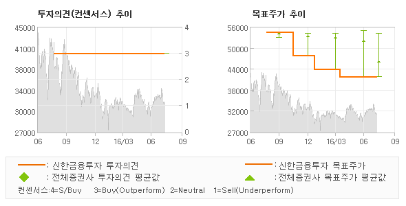 신한금융투자의 동종목에 대한 최근 1년동안의 투자의견은 전체적으로 큰 변화없이 유지되고 있다. 목표주가는 2015년8월 54,500원까지 높아졌다가 2016년4월 42,000원을 최저점으로 목표가가 제시된 이후 최근에도 42,000원으로 제시되고 있다.