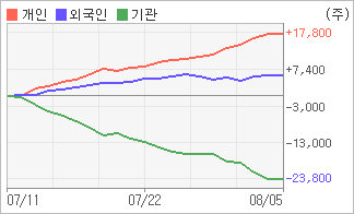 | 외국인/개인 순매수, 기관은 순매도(한달누적) 전일 기관이 95주를 순매수했고, 외국인은 25주를 순매도했다. 4주간을 기준으로 보면 외국인이 초반에 동종목을 순매수한 이후에 기세를 이어가며 5,942주를 순매수했고, 개인들도 순매수량을 늘리며 17,698주를 순매수했다. 하지만 기관은 매도 관점으로 접근하면서 23,640주를 순매도했다. |