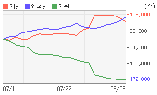 | 외국인/개인 순매수, 기관은 순매도(한달누적) 8월1일부터 전일까지 외국인이 5거래일 연속 동종목을 사들였다. 4주간을 기준으로 보면 외국인이 초반에 동종목을 순매수한 이후에 기세를 이어가며 93,154주를 순매수했고, 개인들도 순매수량을 늘리며 78,098주를 순매수했다. 하지만 기관은 매도 관점으로 접근하면서 171,252주를 순매도했다. |