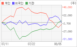 | 외국인/기관 순매수, 개인은 순매도(한달누적) 기관이 4일연속 순매수를 보이고 있는 반면에 외국인은 2일연속 순매도를 보이고 있다. 4주간을 기준으로 보면 외국인이 매매관점을 매도에서 매수로 전환하면서 907주를 순매수했고, 기관도 순매도를 기록하다가 다시 순매수로 돌아서면서 5,332주를 순매수했다. 반면 개인들은 매도 우위로 반전되면서 6,239주를 순매도한 것으로 나타났다. |