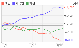 | 기관과 개인은 순매도, 외국인은 순매수(한달누적) 8월2일부터 전일까지 기관이 4거래일 연속 순매수했다. 4주간을 기준으로 보면 외국인이 초반에 동종목을 순매수한 이후에 기세를 이어가며 11,040주를 순매수한 반면, 기관은 매도 우위를 보이면서 1,900주를 순매도했고, 개인들도 매도쪽으로 방향을 잡으면서 9,140주를 순매도한 것으로 집계됐다. |