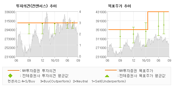 | 의견제시일자 | 증권사 | 투자의견 | 목표가 | | 20160906 | NH투자증권 | 매수(유지) | 430,000 | | 20160902 | 신한금융투자 | 매수 | 350,000 | | 20160729 | 대신증권 | 매수 | 370,000 | | 20160728 | KB투자증권 | 매수(유지) | 370,000 |