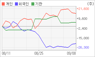 | 기관/개인 순매수, 외국인은 순매도(한달누적) 9월7일부터 전일까지 외국인이 2거래일 연속 순매수를 보였다. 4주간을 기준으로 보면 기관이 초반에 동종목을 순매수한 이후에 최근에는 순매수량이 줄어들고 있음에도 불구하고 5,104주를 순매수했고, 개인들도 순매수량을 늘리며 16,110주를 순매수했다. 반면 그 동안 외국인은 매도 우위를 지속하면서 21,214주를 순매도했다. |