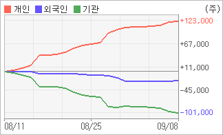 | 외국인과 기관은 순매도, 개인은 순매수(한달누적) 기관이 6일연속 주식을 팔고 있는 반면 외국인은 3일연속 주식을 사고 있다. 4주간을 기준으로 보면 외국인이 매도 우위를 지속하면서 22,225주를 순매도했고, 기관도 매도 관점으로 접근하면서 100,058주를 순매도했지만, 개인은 오히려 순매수량을 늘리며 122,283주를 순매수했다. |