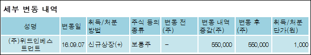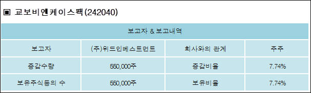 교보비엔케이스팩(242040)은 12일 주주 (주)위드인베스트먼트의 보유주식이 증가되었다고 발표했다. 이는 직전 보고일보다 550,000주 증가하여 지분율은 7.74%로 상승했다. 이번 보고 사유는 해당회사의 코스닥시장 상장에 따른 신규보고로 알려졌다.