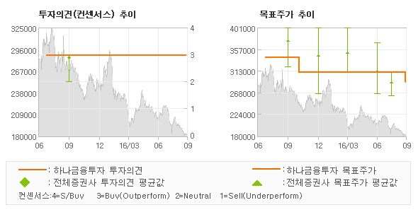 | 오늘 하나금융투자에서 발표된 '매수'의견 및 목표주가 290,000원은 전체의견에 수렴하면서 시장의 평균적인 기대감이 비교적 객관적으로 표현된 것으로 풀이되며 목표가평균과 대비해서 미미한 차이가 나는 것으로 집계되었다. 참고로 최근에 목표주가를 가장 공격적으로 제시한 대신증권에서 투자의견 '매수(유지)'에 목표주가 310,000원을 제일 보수적인 의견을 제시한 SK증권에서 투자의견 '매수(유지)'에 목표주가 260,000원을 제시한 바 있다. |