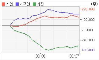 | 외국인/개인 순매수, 기관은 순매도(한달누적) 9월26일부터 전일까지 기관이 2거래일 연속 순매수했다. 4주간을 기준으로 보면 외국인이 매수 우위를 유지하면서 193,429주를 순매수했고, 개인들도 매기를 떨어뜨리면서도 140,625주를 순매수했다. 하지만 기관은 매도 우위를 보이면서 334,054주를 순매도했다. |