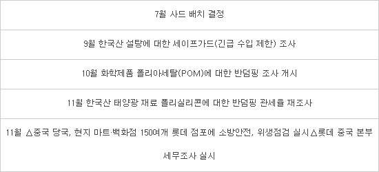 9월 한국산 설탕 세이프가드(긴급 수입 제한) 조사, 10월 한국산 폴리아세탈 반덤핑 조사, 11월 한국산 폴리실리콘 반덤핑 재조사까지 이례 행보가 이어졌다.