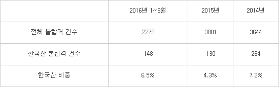 【표2】2014~2016년 중국 식품·화장품 통관 거부 건수(자료 : 한국무역협회)