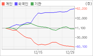 | 기관과 개인은 순매도, 외국인은 순매수(한달누적) 12월27일부터 전일까지 외국인이 3거래일 연속 순매수를 보였다. 4주간을 기준으로 보면 외국인이 초반에 동종목을 순매수한 이후에 기세를 이어가며 62,170주를 순매수한 반면, 기관은 순매수에서 순매도로 반전되면서 2,097주를 순매도했고, 개인들도 매도쪽으로 방향을 잡으면서 60,073주를 순매도한 것으로 집계됐다. |