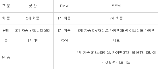 환경부는 청문에 참석하지 않은 포르쉐코리아 7개 차종에 대해 인증취소 처분을 내리고, 한국닛산 1개 차종(캐시카이는 지난해 6월 배출가스 조작으로 이미 인증취소, 검찰 고발됨), BMW코리아 1개 차종을 인증 취소했다.