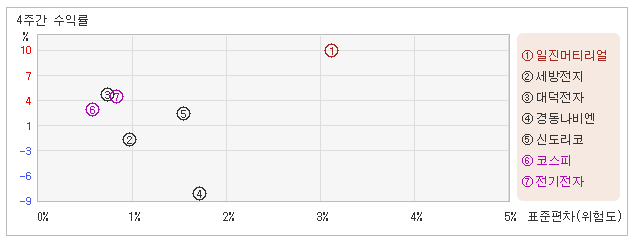 | 위험대비 수익률 3.2로 상위권, 업종지수보다 낮아 2일 오후 2시5분 현재 전일대비 6.09% 하락하면서 13,100원을 기록하고 있는 일진머티리얼즈는 지난 1개월간 10.08% 상승했다. 같은 기간동안에 위험를 나타내는 지표인 표준편차는 3.1%를 기록했다. 이는 전기전자 업종내에서 주요종목들과 비교해볼 때 일진머티리얼즈의 월간 주가수익률이 가장 높았던 만큼 변동성도 가장 높은 수준을 유지했다는 뜻이다. 최근 1개월을 기준으로 일진머티리얼즈의 위험을 고려한 수익률은 3.2를 기록했는데, 변동성은 컸으나 주가상승률이 괜찮았기 때문에 위험대비 수익률도 높은 수준을 나타냈다. 다만 전기전자업종의 위험대비수익률 4.8보다는 낮았기 때문에 업종대비 성과는 뛰어났다고 할 수 없다. 다음으로 업종과 시장을 비교해보면 일진머티리얼즈가 속해 있는 전기전자업종은 코스피지수보다 변동성과 수익률이 모두 높은 모습이다. 다시 말하면 동업종에 탄력이 붙으면서 지수대비 초과상승했다는 의미이다. |