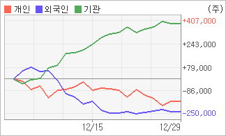 | 외국인과 개인은 순매도, 기관은 순매수(한달누적) 12월28일부터 전일까지 기관과 외국인은 2거래일연속 동반 순매도했다. 4주간을 기준으로 보면 기관이 방향성있는 매매를 하면서 391,474주를 순매수한 반면, 외국인은 매도 우위를 지속하면서 234,474주를 순매도했고, 개인들도 매도쪽으로 방향을 잡으면서 157,000주를 순매도했다. |