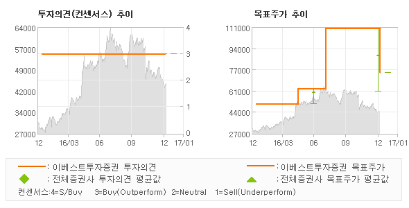 | 의견제시일자 | 증권사 | 투자의견 | 목표가 | | 20170103 | 이베스트투자증권 | 매수(유지) | 75,000 | | 20161226 | 신한금융투자 | 매수(유지) | 60,000 |