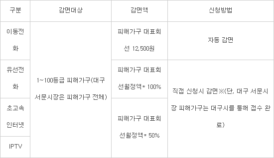 이동전화는 피해를 입은 가구당 대표회선에 대해 1만2500원을 감면한다. 유선전화는 청구 기준 월정액 100%, 초고속인터넷과 IPTV 서비스는 청구 기준 월정액의 50%를 감면한다.