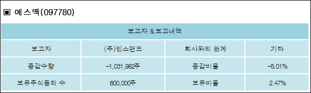에스맥(097780)은 03일 기타 (주)인스앤드를 비롯한 특별관계자의 보유주식이 감소되었다고 발표했다. 이는 직전 보고일보다 1,031,982주 감소하여 지분율은 2.47%로 하락했다. 이번 보고 사유는 1.보유목적변경,2.대량보유보고의무해지로 알려졌다.