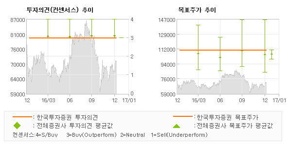 | 의견제시일자 | 증권사 | 투자의견 | 목표가 | | 20170105 | 한국투자증권 | 매수(유지) | 110,000 | | 20170102 | NH투자증권 | 매수(유지) | 99,000 | | 20161229 | 하이투자증권 | 매수(유지) | 125,000 | | 20161228 | 유진투자증권 | STRONG BUY(유지) | 115,000 |