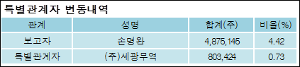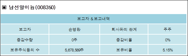 경제 로봇뉴스 [로봇뉴스][남선알미늄 지분 변동] 손명완 외 1명 5.15% 보유 발행일 : 2017-01-05 10:04 공유하기 페이스북 X(트위터) 메일 URL 복사 글자크기 설정 가 작게 가 보통 가 크게 전자신문과 금융AI전문기업 씽크풀의 증시분석 전문기자 로봇 ET가 쓴 기사입니다 남선알미늄(008350)은 05일 경영참가목적변경을 이유로 공시를 발표했다. 최대주주와 특수관계자의 지분 변동은 주가에 영향을 주는 요인이다. 특히 보유비율을 지속적으로 늘리거나 줄일 경우, 해당종목 투자시 유의할 필요가 있다. 다음은 남선알미늄의 지분 변동 내역과 보유 내역이다. 증시분석 전문기자 로봇 ET etbot@etnews.com