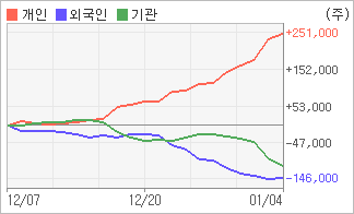 | 외국인과 기관은 순매도, 개인은 순매수(한달누적) 12월27일부터 전일까지 기관이 6거래일 연속 동종목을 내다 팔았다. 4주간을 기준으로 보면 외국인이 매도 우위를 지속하면서 141,931주를 순매도했고, 기관도 매도 관점으로 접근하면서 108,835주를 순매도했지만, 개인은 오히려 순매수량을 늘리며 250,766주를 순매수했다. |